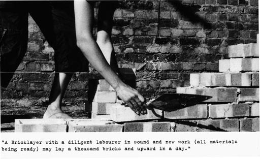 | A 4 week performance at the Slade Research Centre between July and August 2006 during which time a 70ft long, 6ft high, 9 '' wide brick wall was built and subsequently destroyed, running through a series of rooms on the 5th floor of a building in central london. |